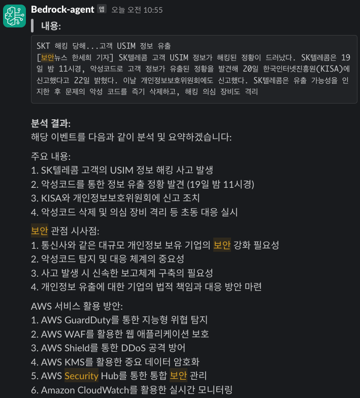- Bedrock에서 생성된 자연어 응답을 Lambda가 Slack API로 다시 전달