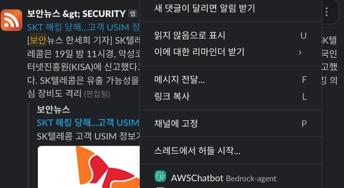 Slack에서 챗봇에게 멘션(@봇)을 통해 보안 로그 분석을 요청하면, Amazon Bedrock의 Claude 모델을 활용하여 실시간으로 보안 로그를 분석하고, 간결하고 이해하기 쉬운 형태로 응답을 제공합니다. 이를 통해 IT/보안팀이 빠르게 상황을 파악하고 대응할 수 있도록 지원합니다. 🚨🔍