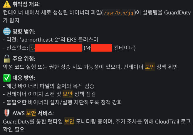 사용자: "@SecurityBot 최근 GuardDuty 경고 요약해줘!"