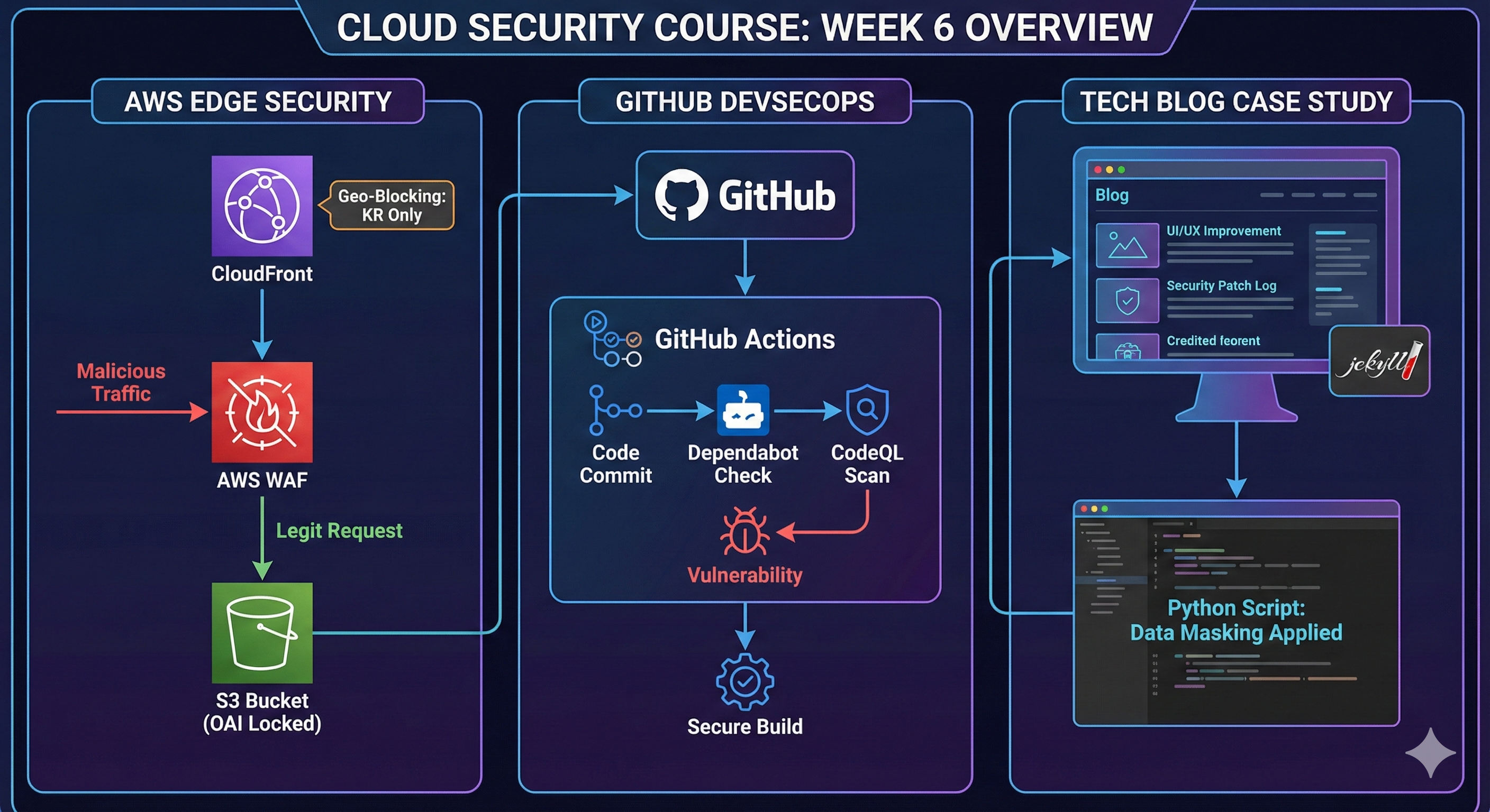 지난 5주차에서는 AWS Control Tower와 Datadog SIEM, Cloudflare를 활용한 거버넌스와 관제에 대해 다루었습니다. 이번 클라우드 보안 과정 8기 6주차에서는 AWS WAF와 CloudFront를 결합한 안전한 콘텐츠 전송 아키텍처와, 개발과 보안을 통합하는 GitHub DevSecOps, 그리고 엔지니어의 성장을 위한 테크 블로그 운영 및 실제 보안 적용 사례를 공유하고자 합니다.